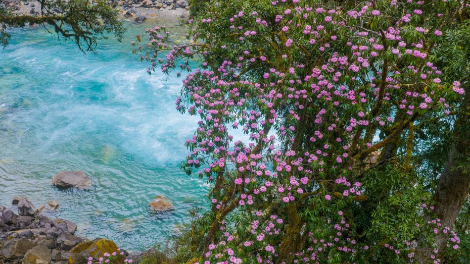 सिचाङको यिगोङ नदी किनारमा हिमाली अलेलिया पूर्ण रूपमा फुलेका